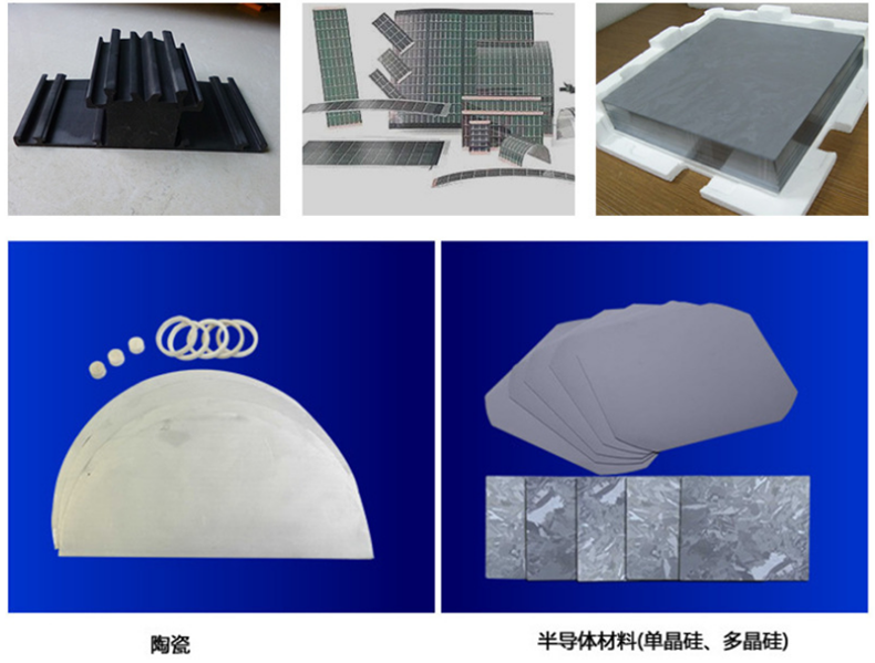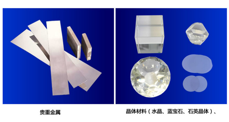 可用于切割玉石、玻璃、陶瓷、石墨、瑪瑙、紅寶石、藍(lán)寶石、亞克力、單晶硅、多晶硅、碳化硅、耐火材料、巖樣、復(fù)合材料、環(huán)氧板、鐵氧體等不導(dǎo)電材料的切片開方及直體異形的加工切割